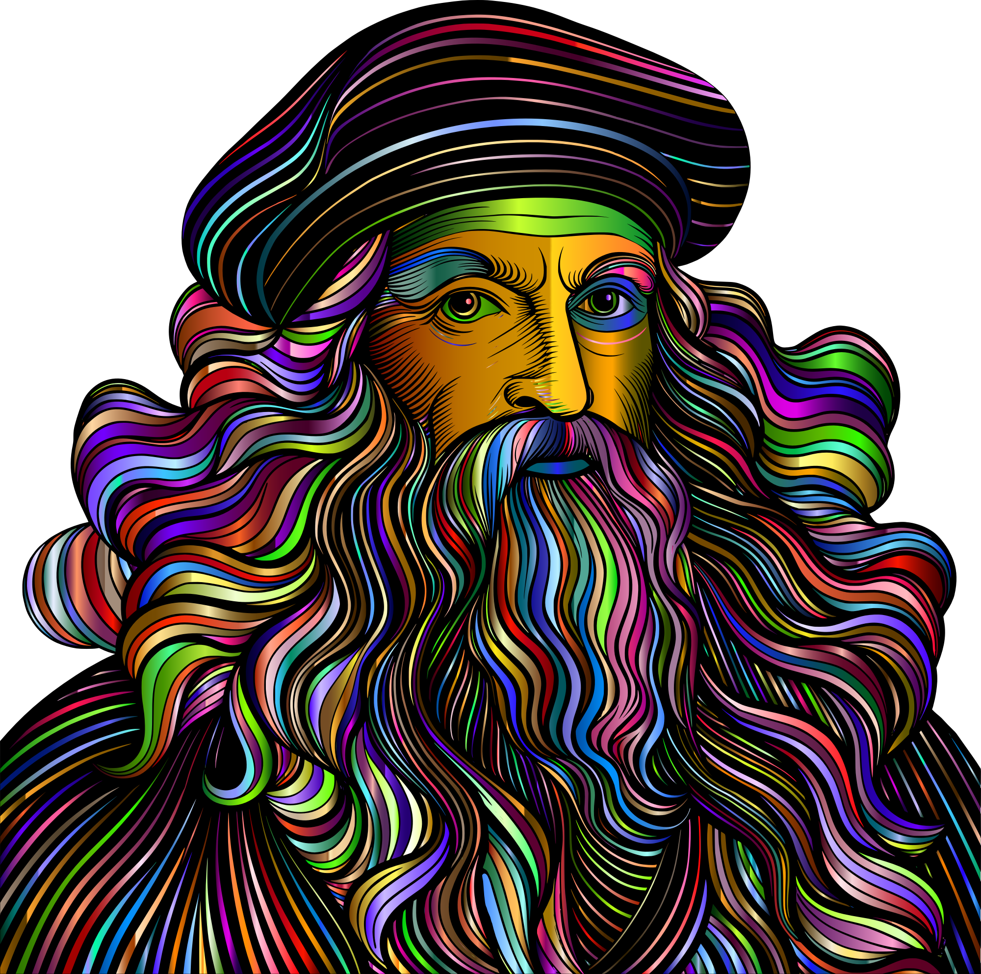 - Leonardo Da Vinci Portrait Line Art Renaissance Science Scientist Italy Italian Artist Painter Man People Person Human Colorful Prismatic Chromatic Rainbow Psychedelic ai_art