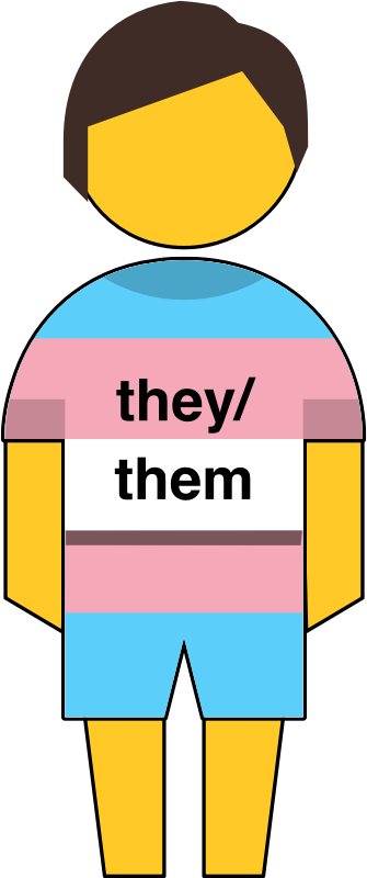 Child wearing a T-shirt and shorts in transgender flag colors, with "they/them" pronouns on the T-shirt. The yellow emoji of the child has fairly short brown hair and no facial expression.
