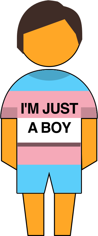 Transgender pre-teen boy symbol with a T-shirt saying "I'm just a boy". The emoji is orange with short dark hair and no facial expression.