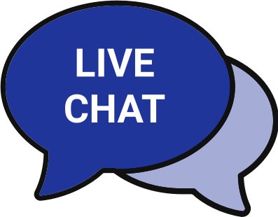 Two overlapping chat icons in dark blue and light blue than the other. White text says LIVE CHAT.