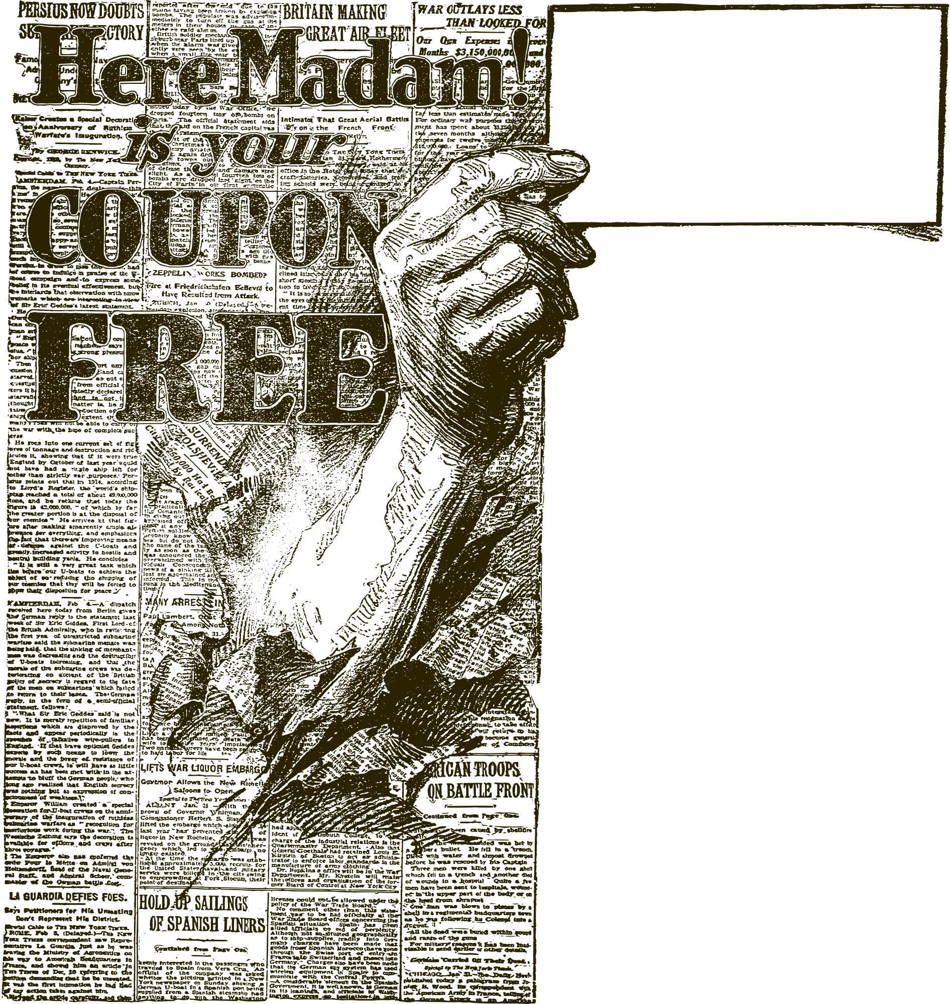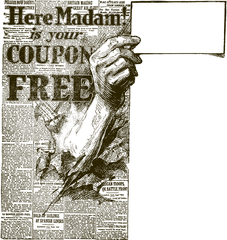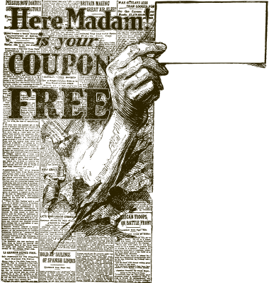 a hand breaking through a newspaper with vintage odd text proclaiming "here madam! is your coupon free"