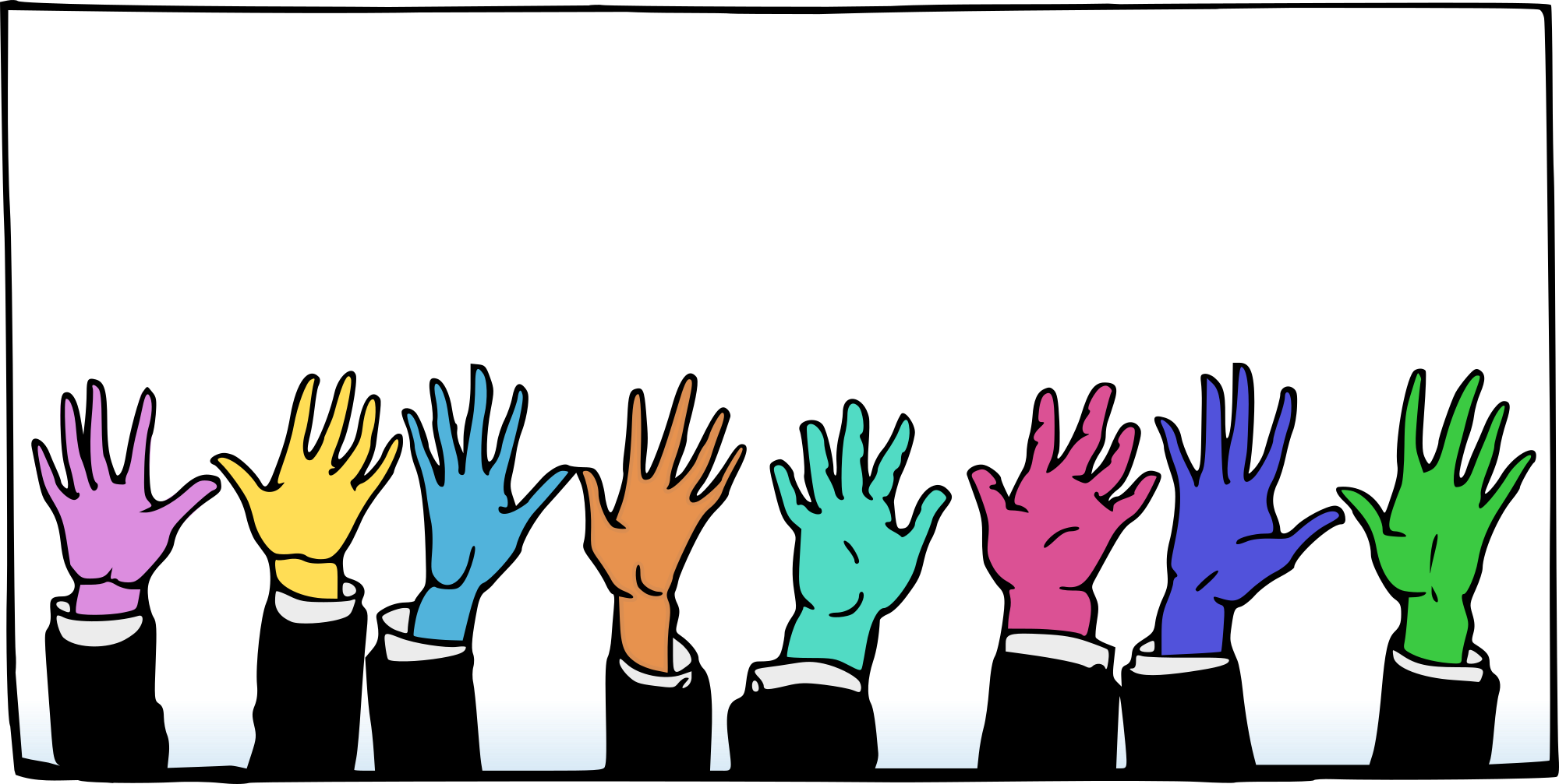 many colours of raised hands in a frame