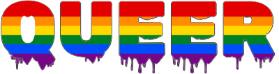 Uppercase word "queer" in pride colors with queer in a graffiti paint effect font with paint dripping.