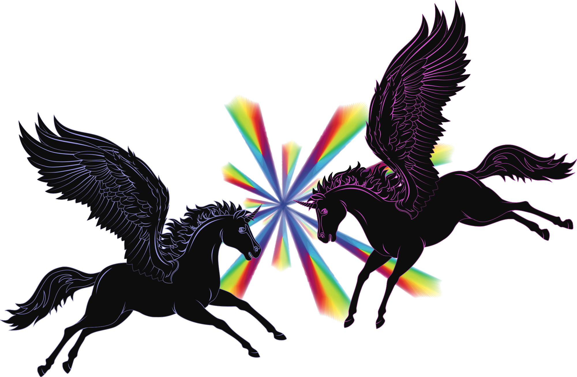 a rainbow blast between two pegasus-unicorns pointing at each other