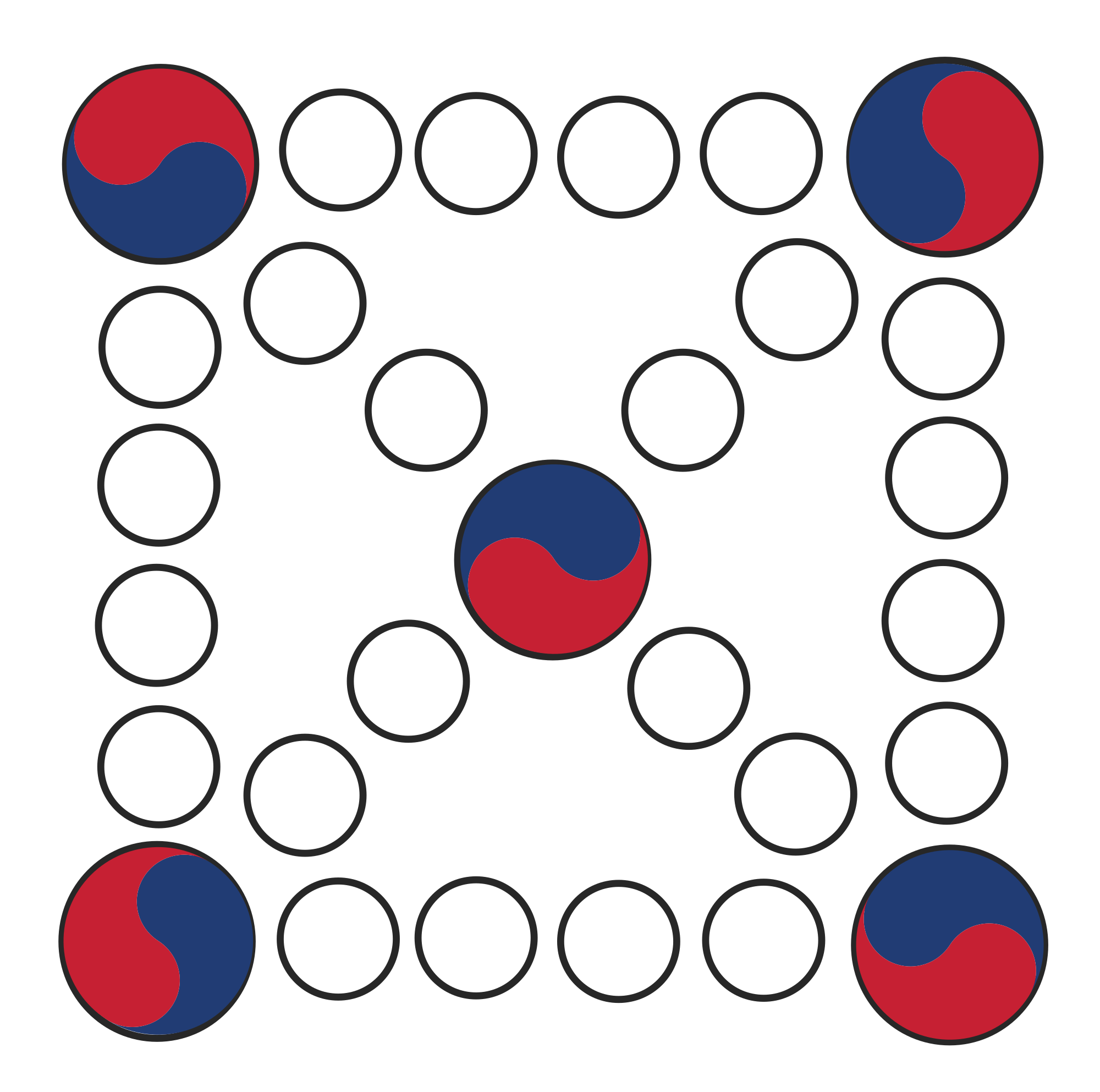 Yutnori is a traditional Korean board game; it is played with thrown sticks instead of dice, but this is just the board game. Printable if you wanted to do that. (No requirement for the Korean flag swirls, that's just a design flourish of course.)