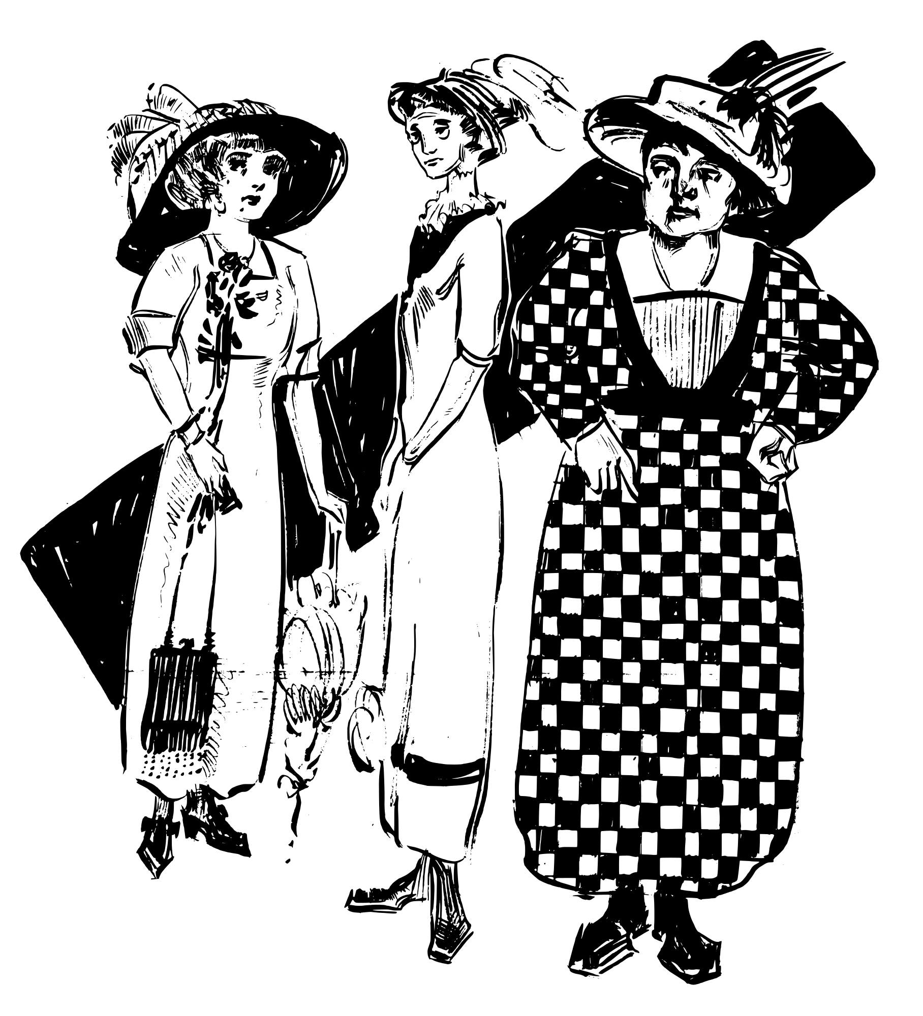 three ladies standing in dresses