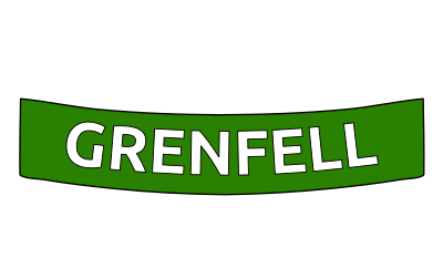 Grenfell in capitals on a green banner, in memory of victims and survivors of the Grenfell Tower fire in 2014, and their loved ones.