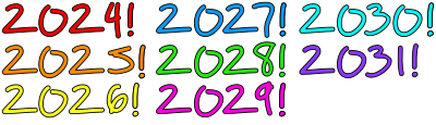 Years 2024 to 2031 with exclamation mark in cyan in bojarksi font by UpandIt with all digits increased using 8pt outline, then outlined again in black. A few digits resized (1, 3, etc) to normalise height a bit more. Rainbow colors plus cyan.