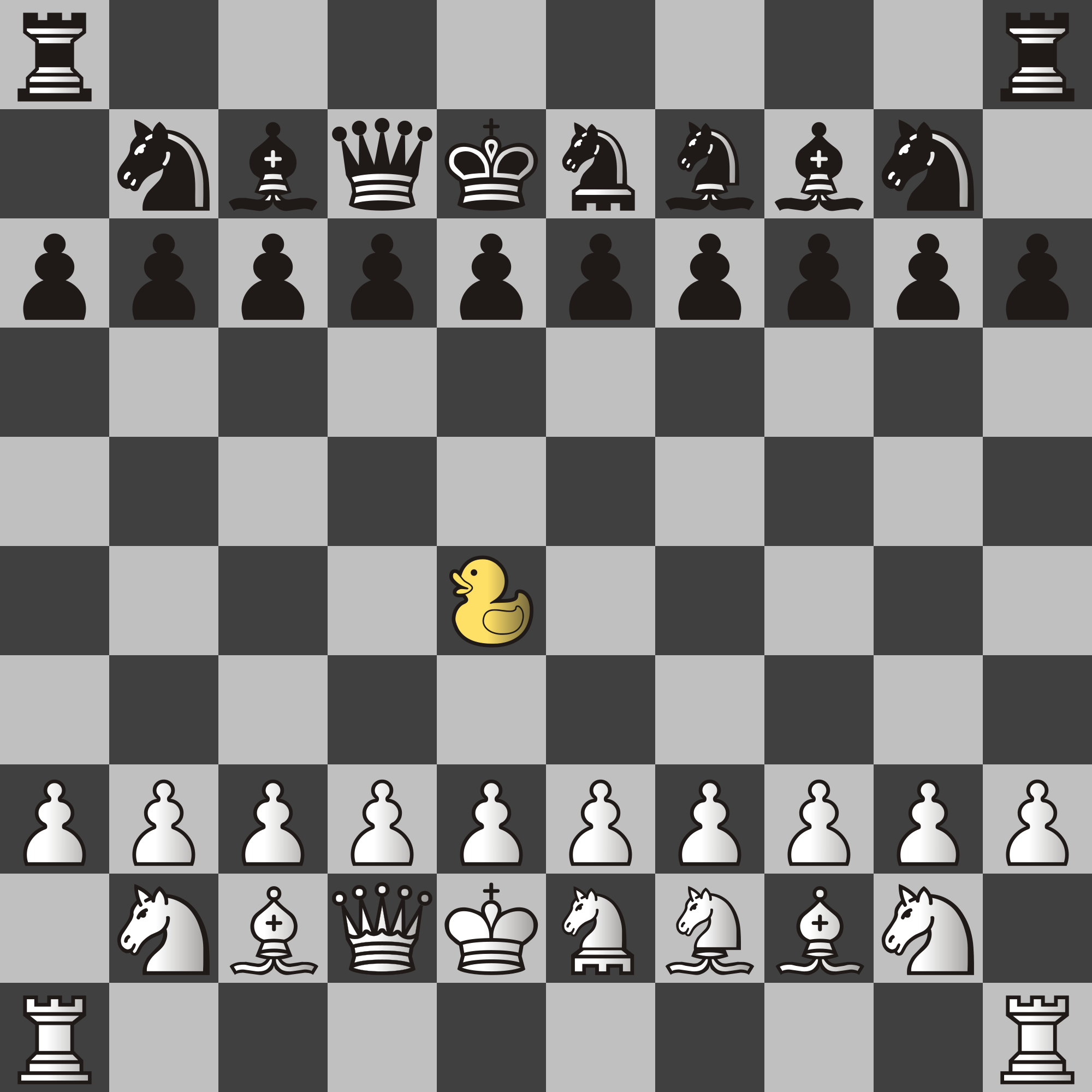 The pieces for this set are from the open source PyChess project, but I resized them for making what I thought looked like the perfect Grand Chess set. This is a variant which is actually playable on PyChess but the Duck is something I added and isn't normally in the game.