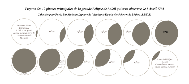 Figures des 12 phases principales de l'éclipse de soleil calculées pour Paris en 1764 par Nicole-Reine Lepaute de l'Académie royale des sciences de Béziers. Dessin à partir de l'original que l'on peut trouver à la BnF Gallica :