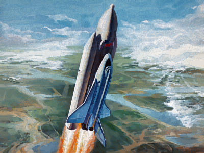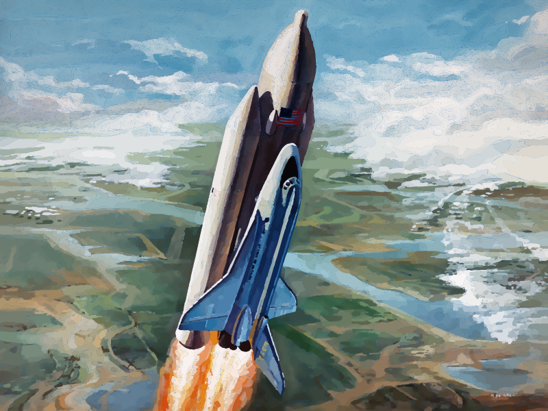This is a 1973 depiction (and thus not 100% accurate) of the NASA space shuttle blasting off earth (based on a public domain old NASA painting)