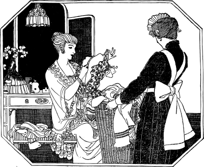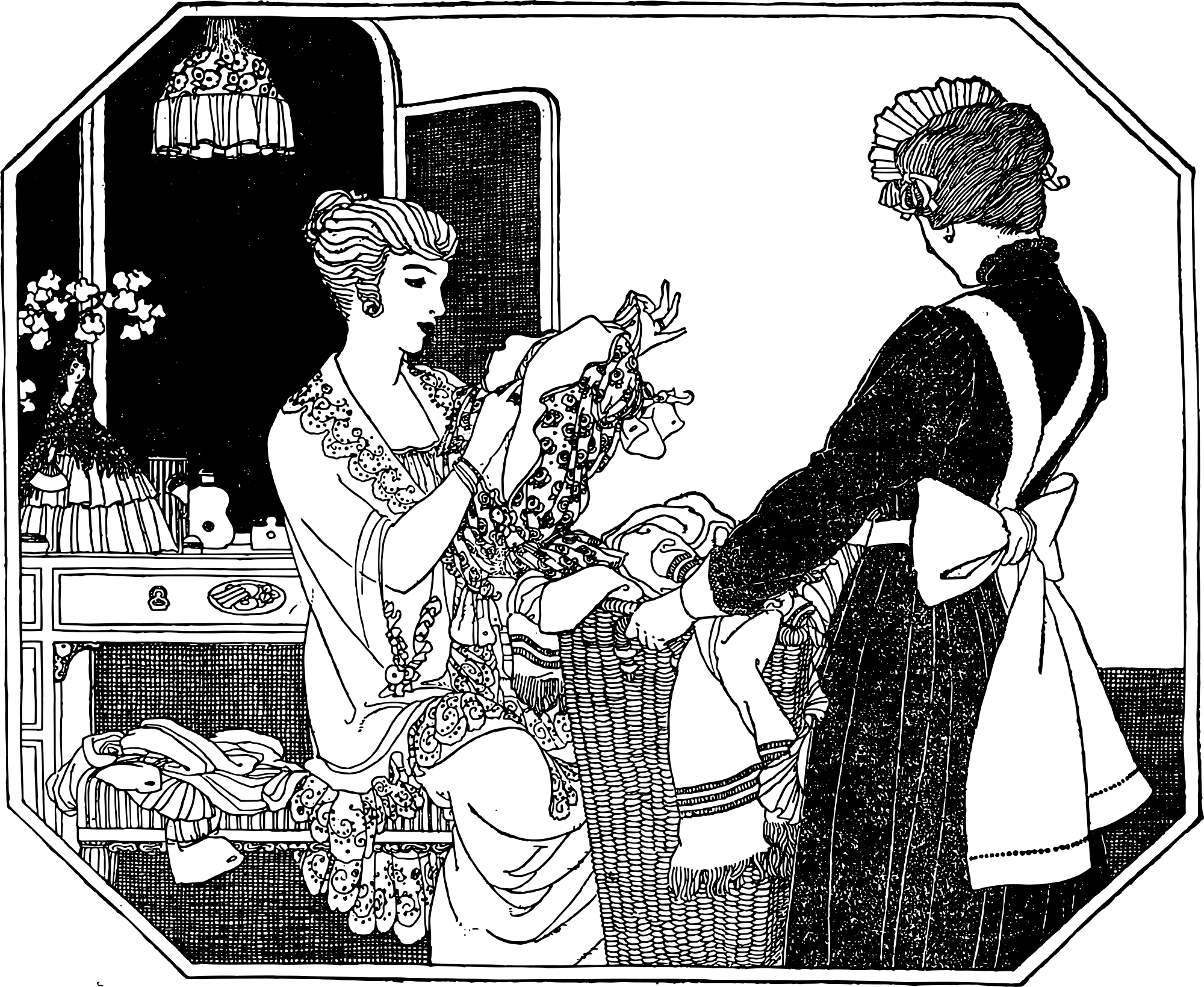 this lady is handing this other lady (who appears to be employed as a maid) some clothes, maybe to be washed as laundry