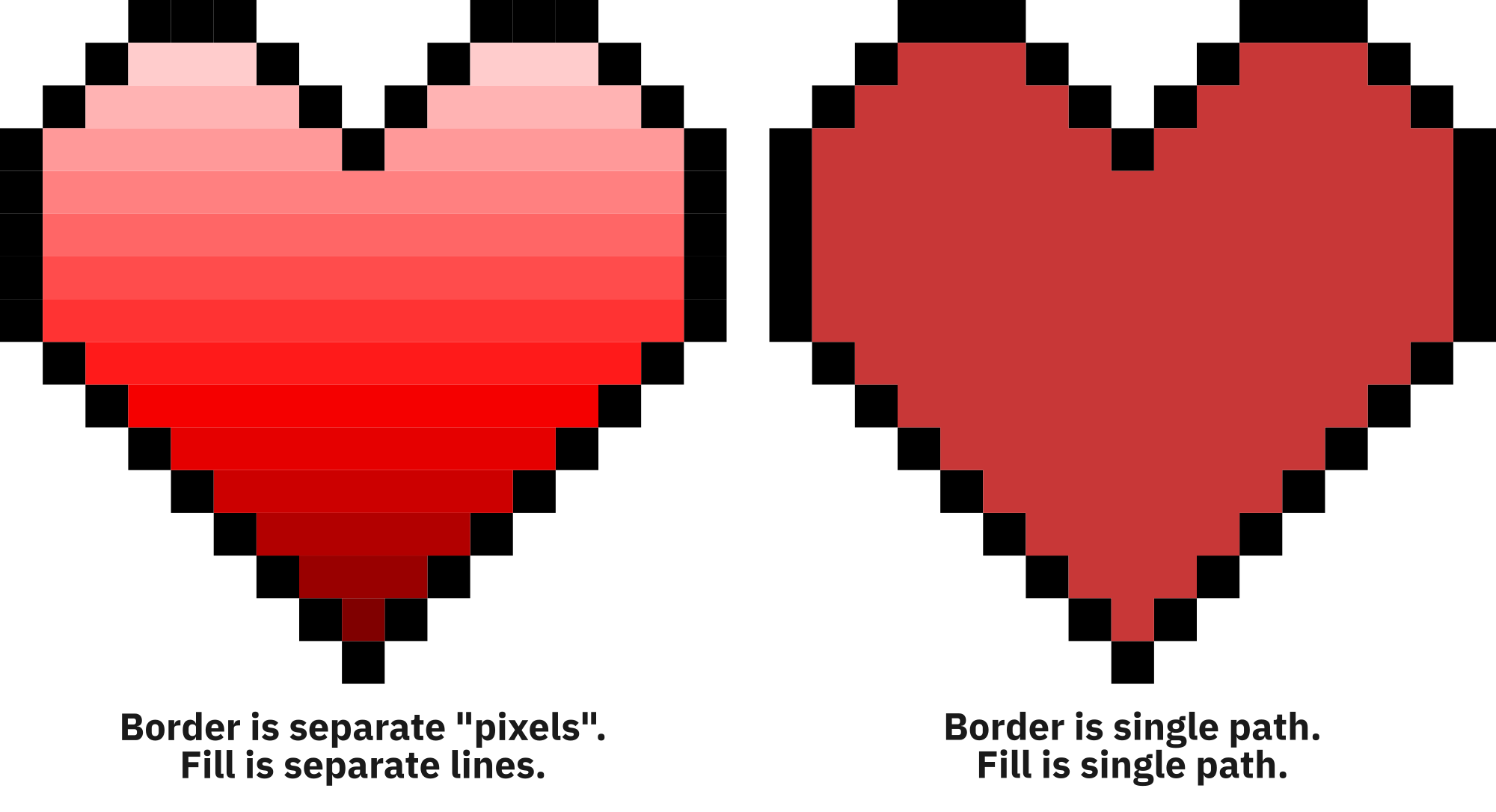 A pair of pixel art hearts. One has an outline made of individual 18x18 "pixel" squares and individual lines. The other has an outline made of a single path, and a fill made of a single path.