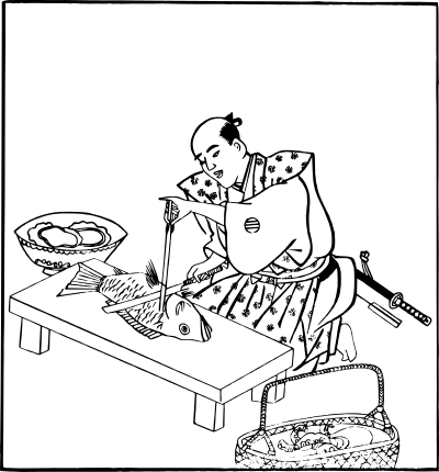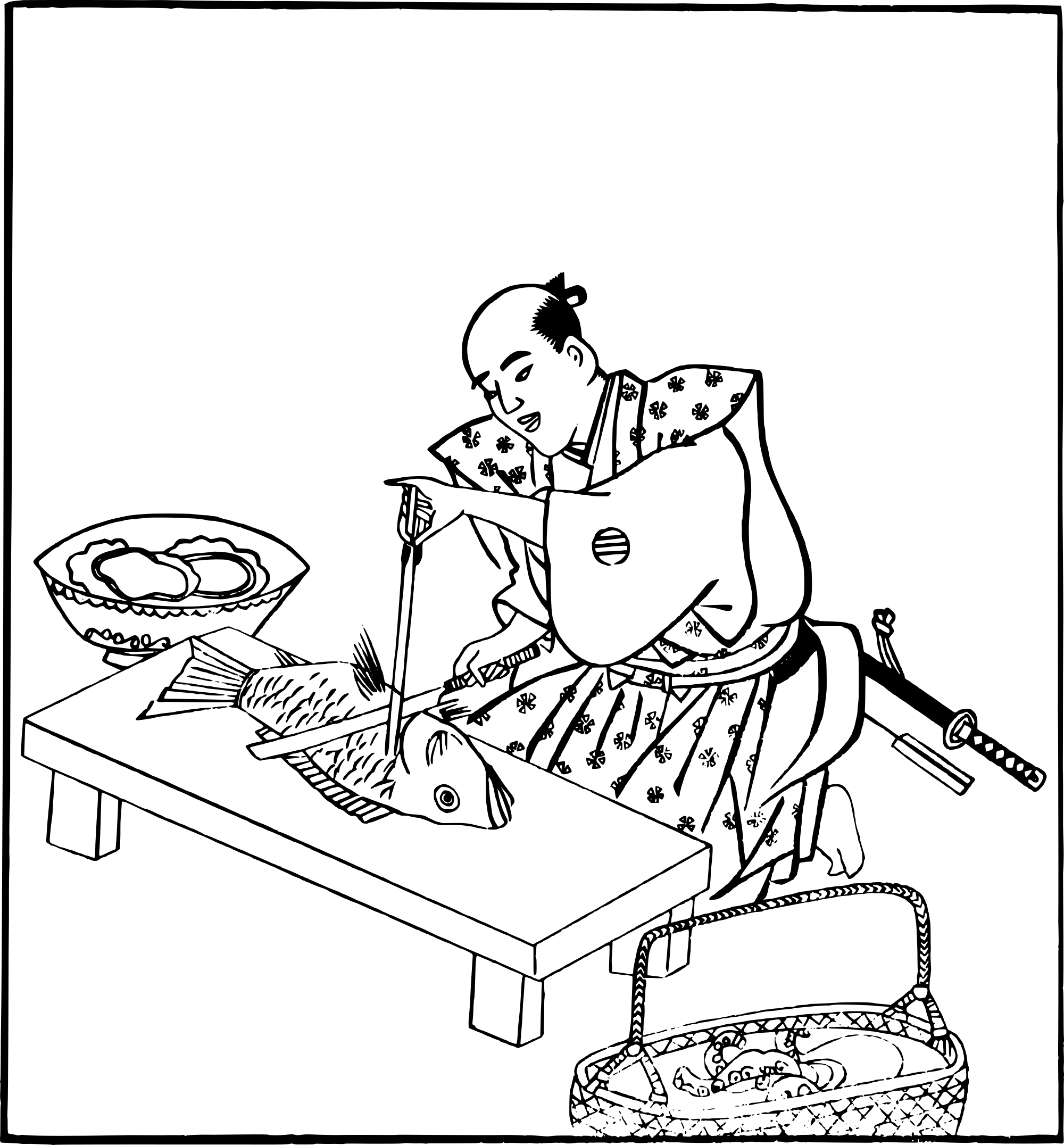 fishmonger (or a sushi chef?) with a big fish (based on an old public domain Japanese drawing)