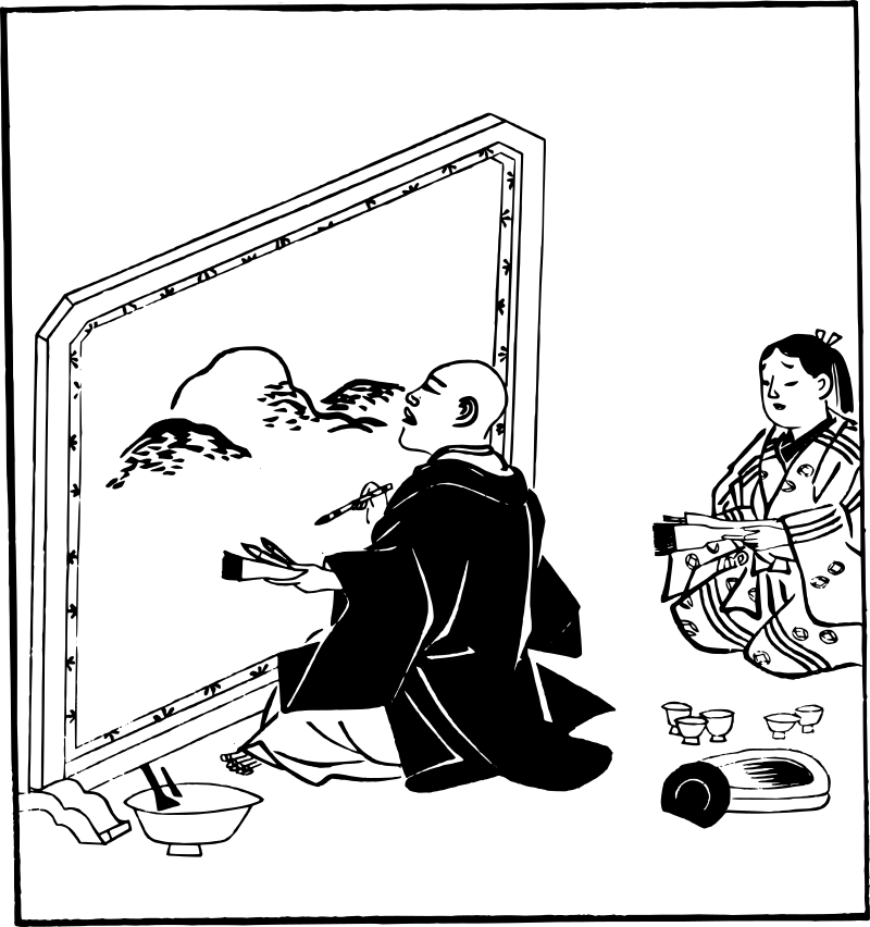 assistant helps an artist (based on an old public domain Japanese drawing)