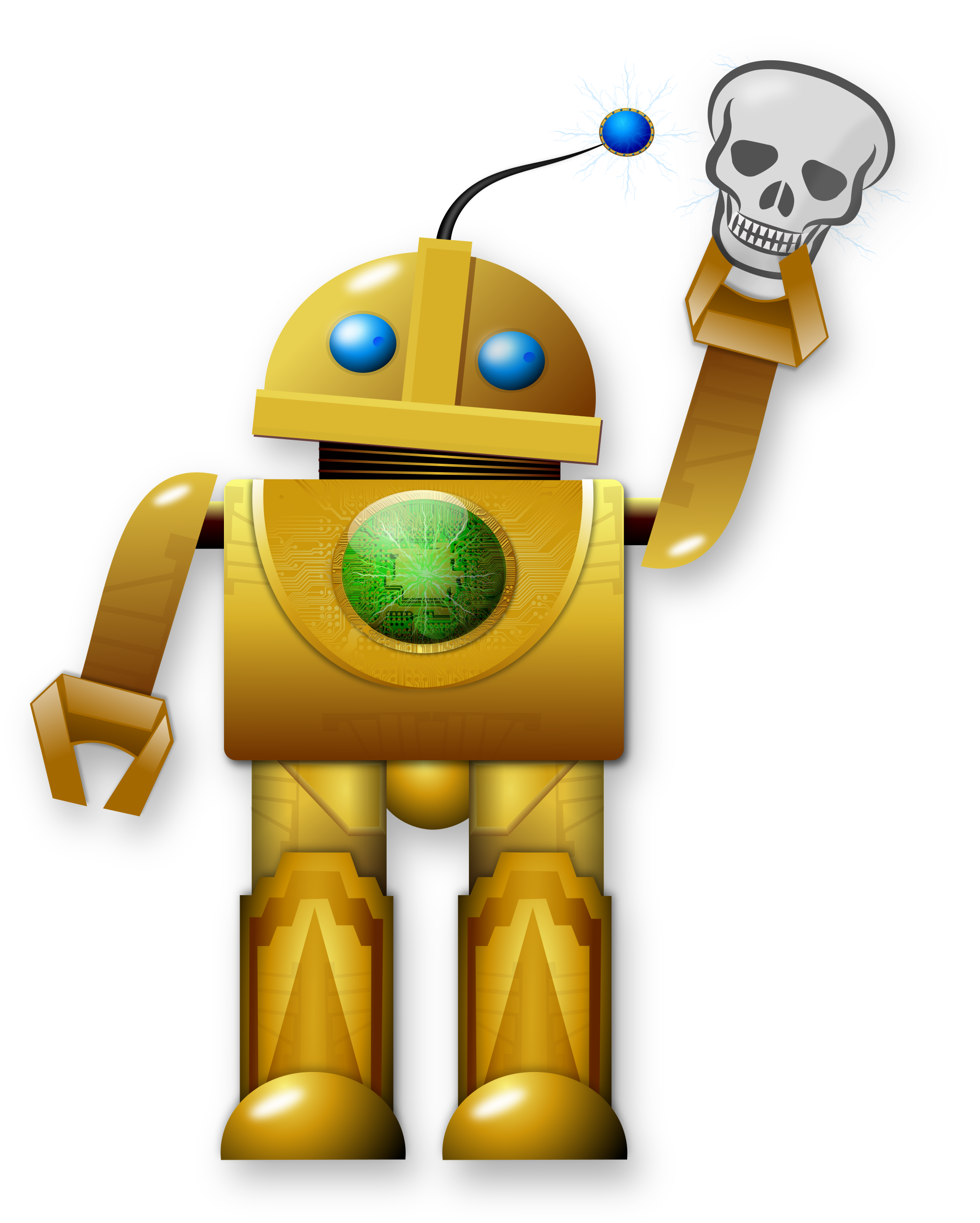 Either a scary skull pulling robot or a friendly robot archeologist, but in any case this is a robot holding up a skull and examining it