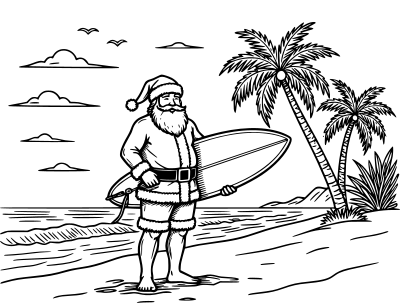 - surfing Santa tropical Hawaii Australia Santa Claus surfboard surfer summer beach palm tree shore surf xmas Christmas fun ai_art