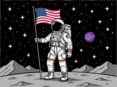 An American astronaut on the surface of an extraterrestrial location, maybe the moon? This was designed to attempt to make a flag swap fairly easy for those that know how... (started out as ai art, but was greatly modified by me...)