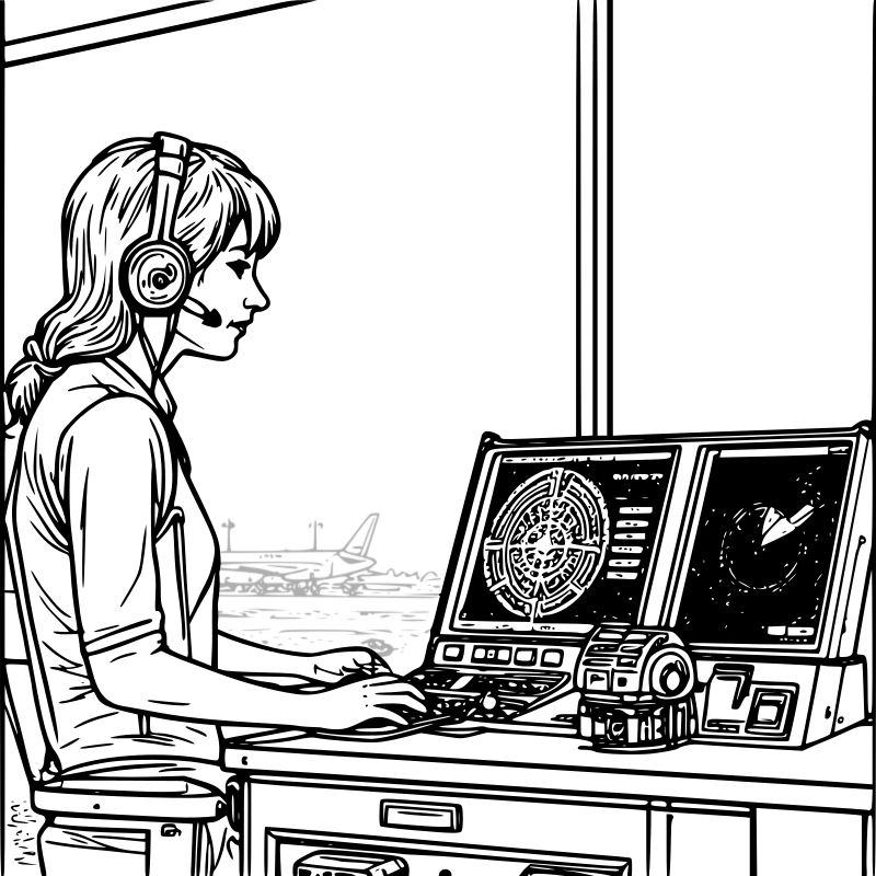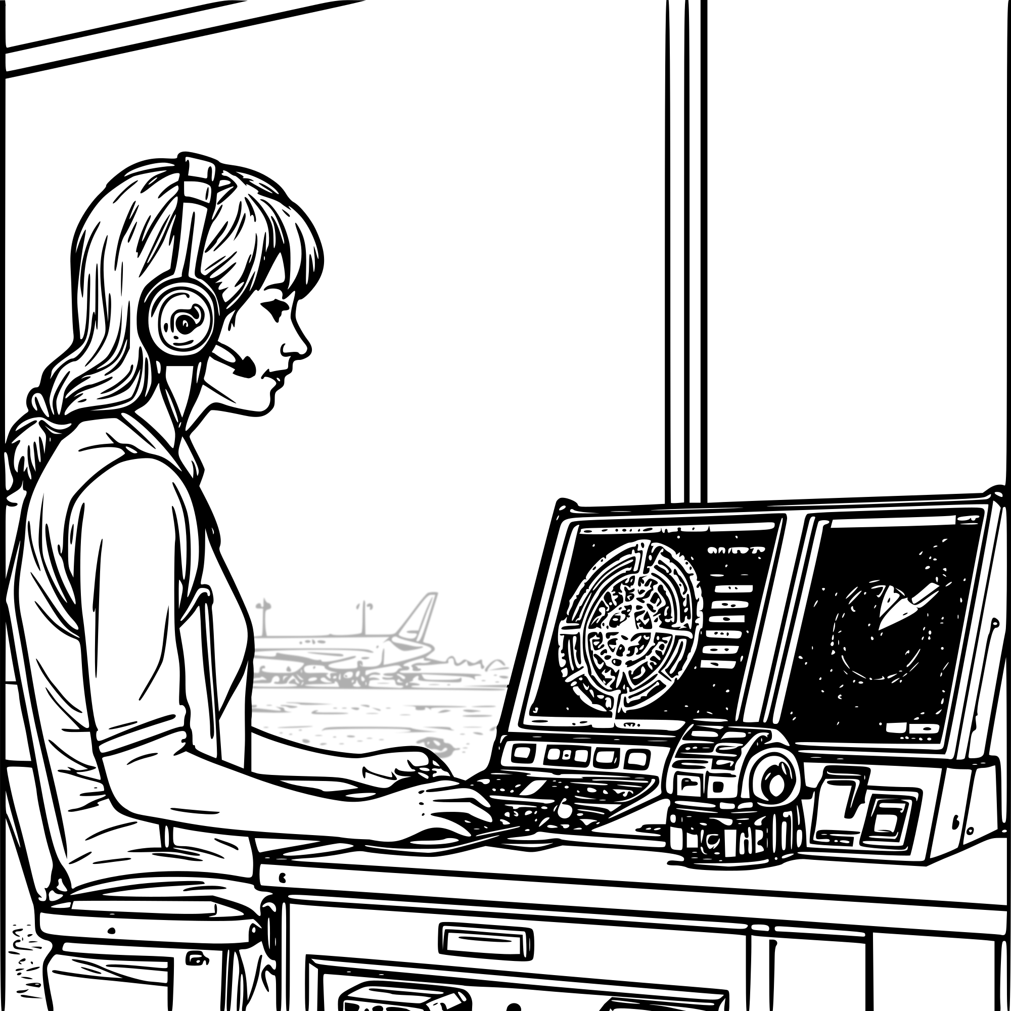 here's the inside of an air traffic control tower with an air traffic controller behind a machine while she helps airplanes navigate to the airport etc