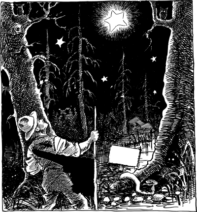 a man looking up at stars while in a swamp