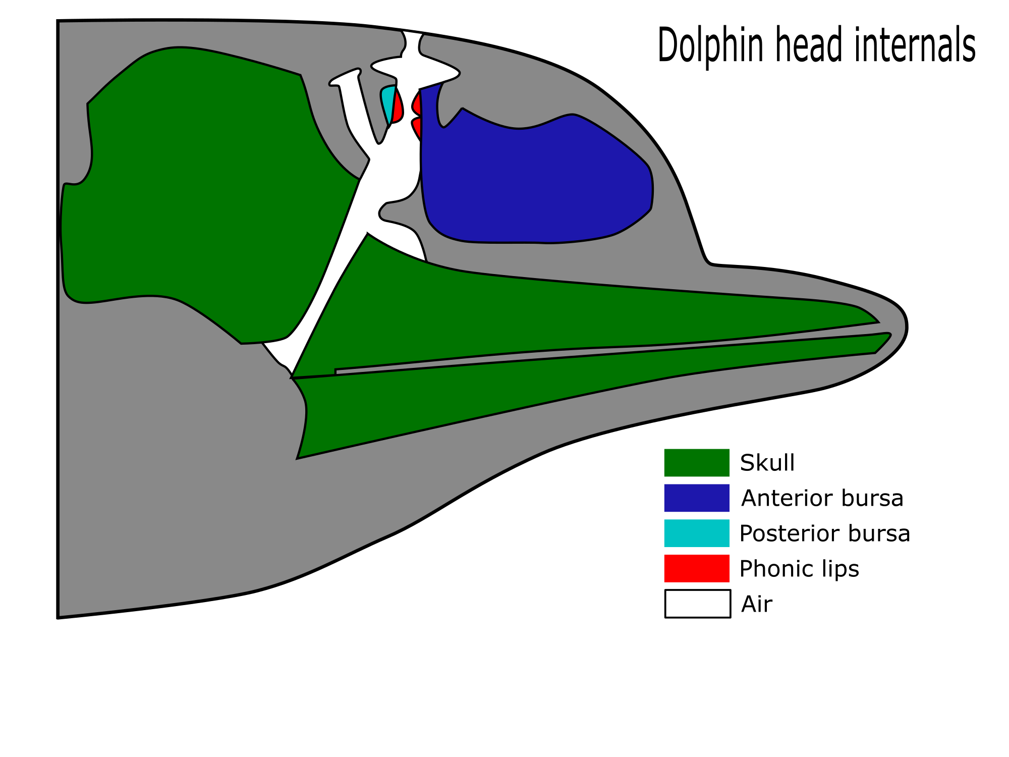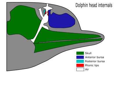 The inside of a dolphin's head. Based on a public domain image shared with Wikimedia by user Petwoe