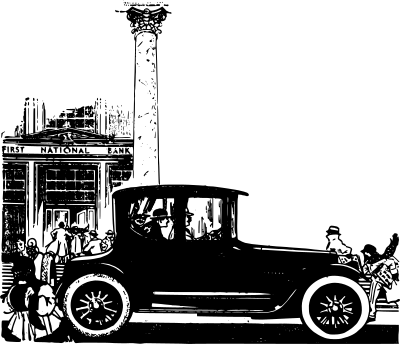 a classic car in front of a bank