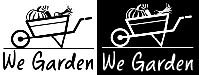 Stylized wheelbarrow loaded with vegetables with "We Garden" below