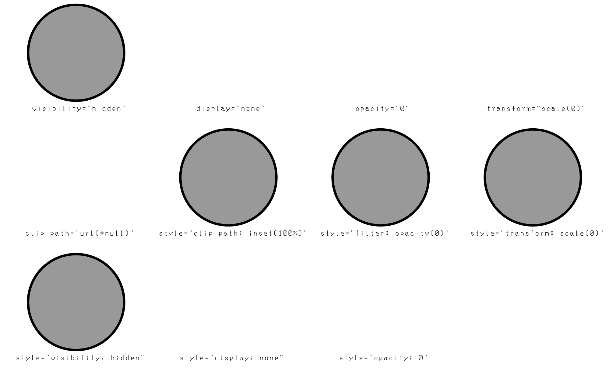 Ideally you see only small text rendered into paths. If you see grey circles with black outlines, these are unsupported methods of hiding SVG shapes. Inkscape 1.2.2 and 1.4.2 for example doesn't support visibility="hidden", style="clip-path inset(100%)", style="filter: opacity(0)", style="transform: scale(0)", style="visibility: hidden", at least not in this file. Chrome 138.0.7204.169 and Firefox 141.0 support all of them.