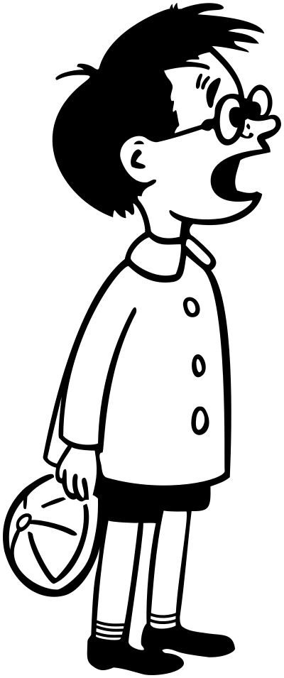 A kid with a wide open mouth speaking, while holding a hat to the side in the right hand. The child is wearing a coat of sorts, black shorts, black shoes and striped socks as well as glasses. In the original comic he is a smarty pants, know-it-all wise guy, apparently making an adult sounding comment to his parents.