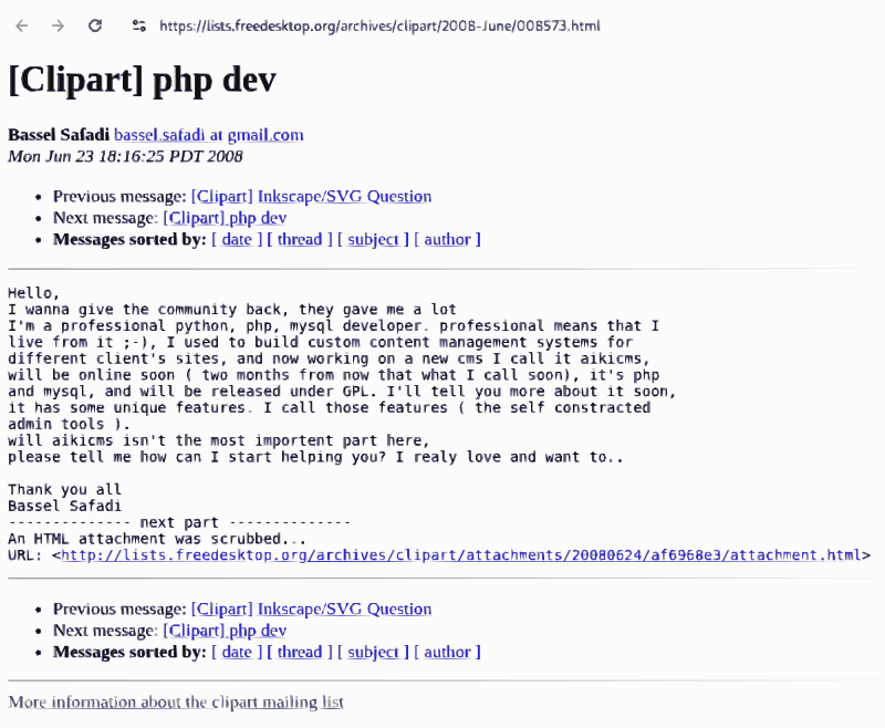 Here is the first message that Bassel Khartabil (known as Bassel Safadi at the time) sent to the Openclipart original mailing list where he freely offered his services to help out our project. The rest is history.