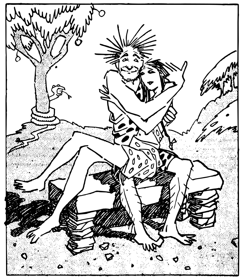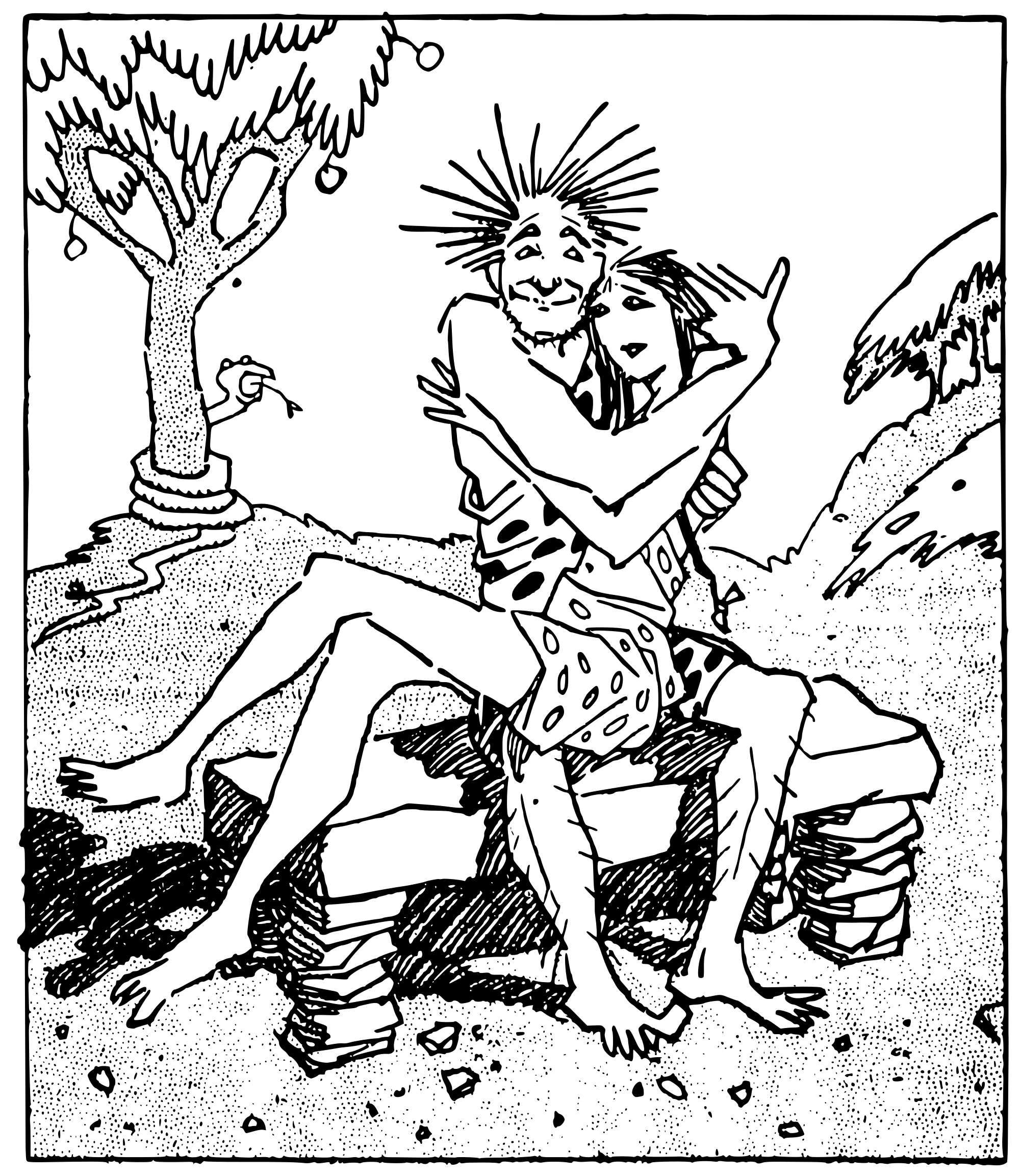 primitive caveman and cavewoman couple (or there's an apple tree and a snake, so maybe cave adam and eve?)