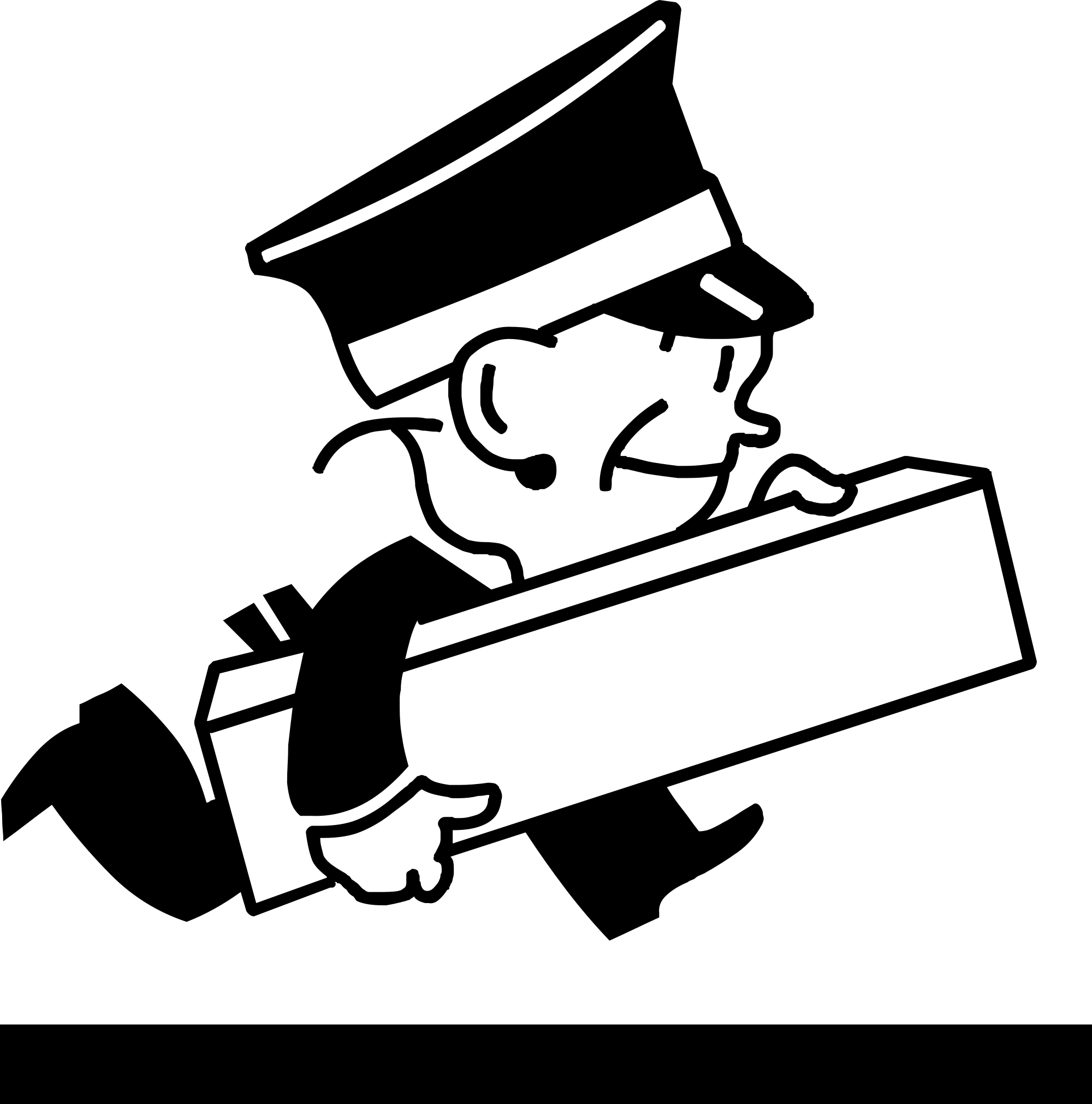 Delivery boy wearing a cap and carrying a box under his arm is running.