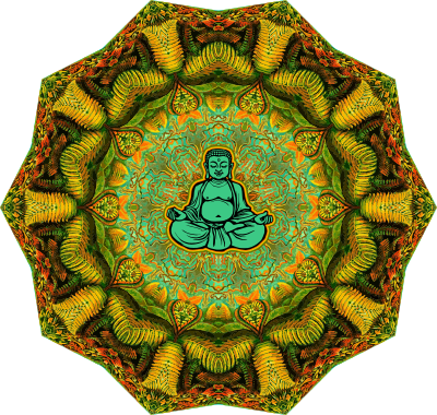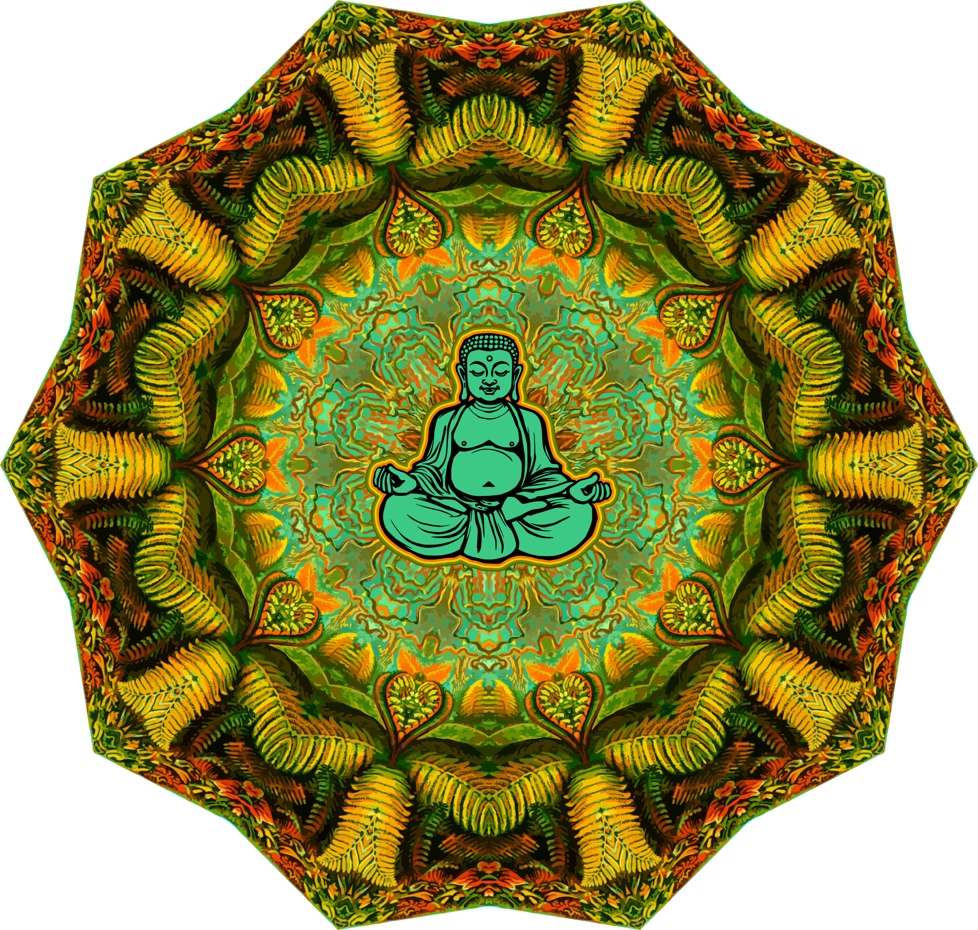 fern mandala with Buddha meditating; travel inside your mind and outside your limits (the buddha started life in the mind of an ai machine)