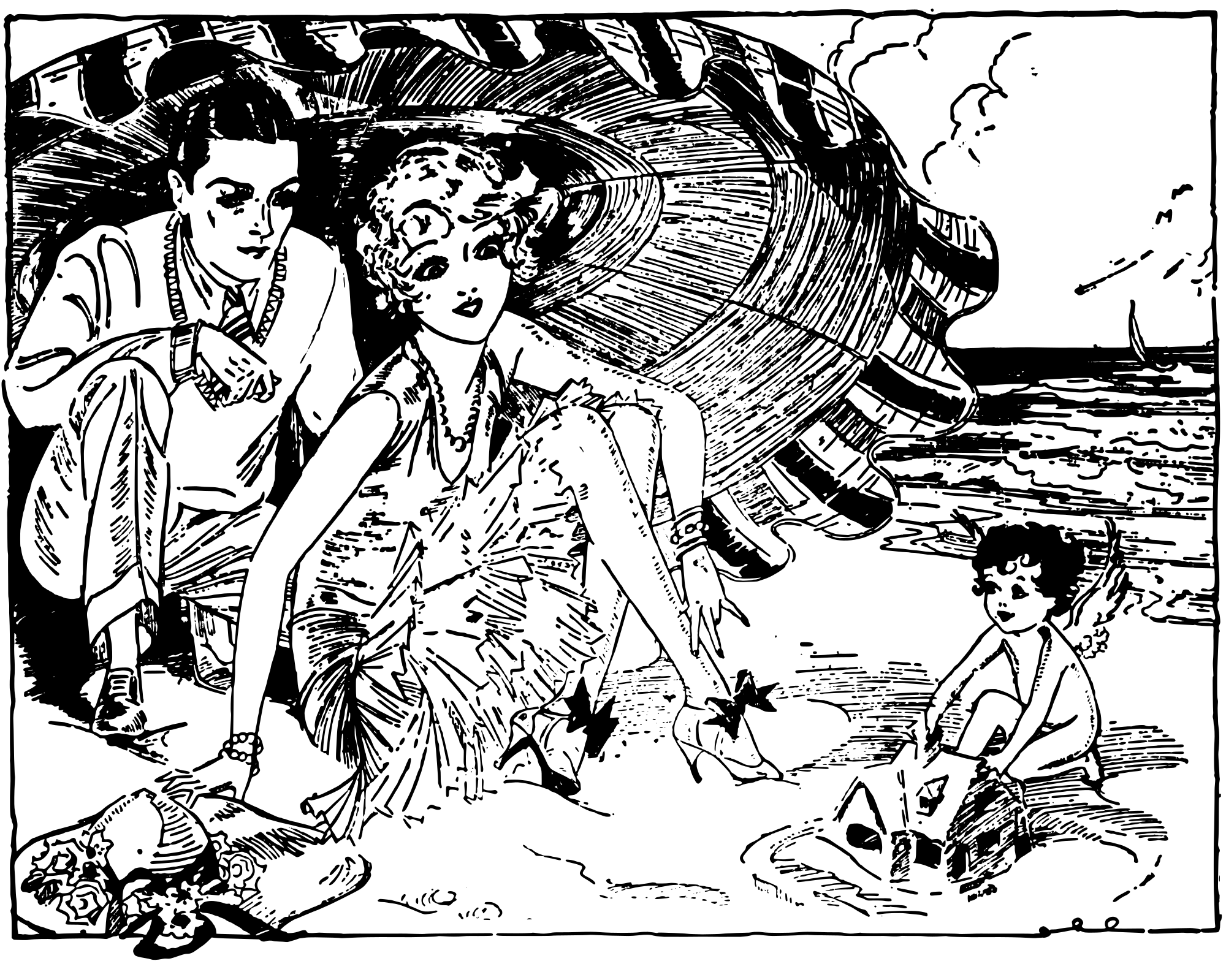 a couple at the beach watching a cherub build a house out of sand