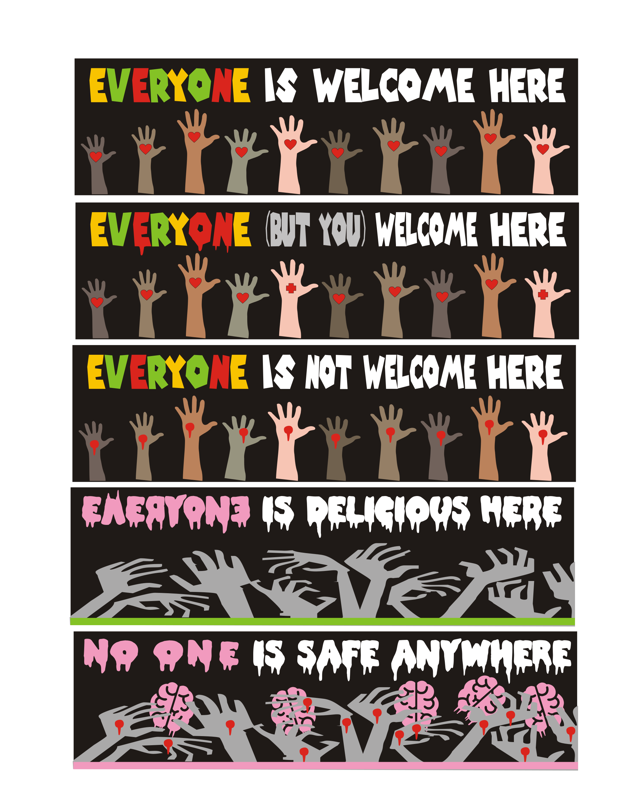 Everyone welcome here. Everyone (but you) welcome here. Everyone is not welcome here. Everyone is delicious here. No one is safe anywhere.