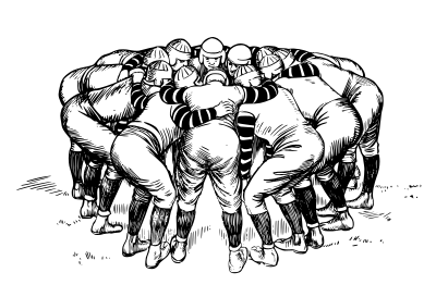 a group of football men in a huddle