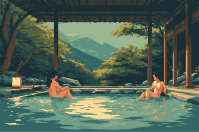 - hot springs bathing onsen two women bathe woman relaxation outdoor nature naturism ai_art 温泉