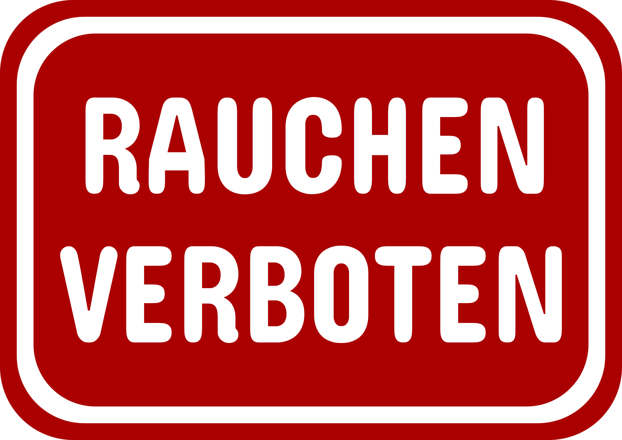 Rauchen Verboten Sign meaning "smoking is forbidden" or "no smoking" in German. Red sign with white inner border white font. Uses SIL OFL font Concert One. Includes editable font layer behind the sign. Created from scratch on top of https://openclipart.org/detail/343293/retro-no-smoking-sign for color and layout. Optimized in SvgOmg.