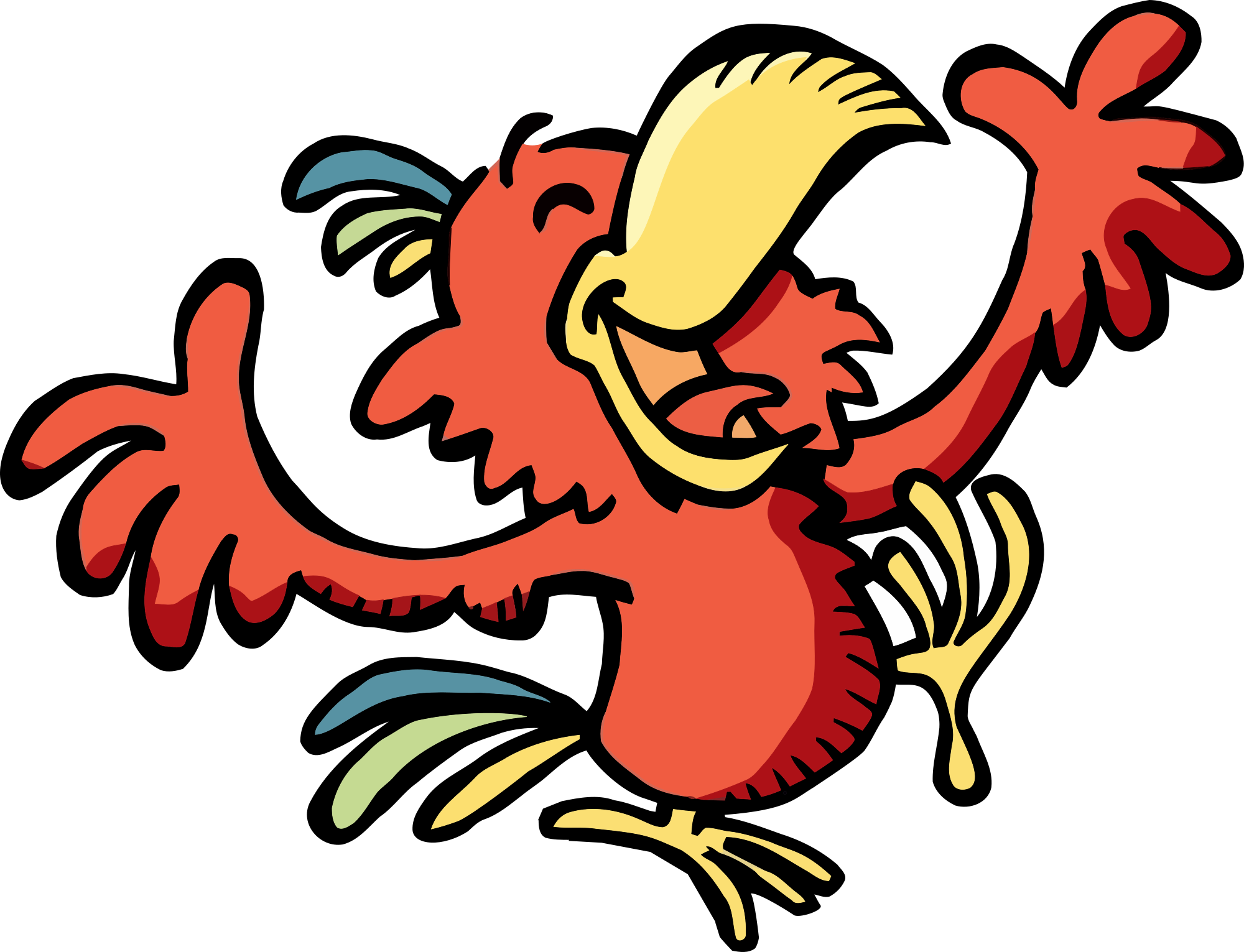 Cute red/orange parrot doing a little dance. Isolation and a little cleanup of https://openclipart.org/detail/314002/pirate-finds-treasure-by-richardsdrawings in Inkscape, optimized with SvgOmg