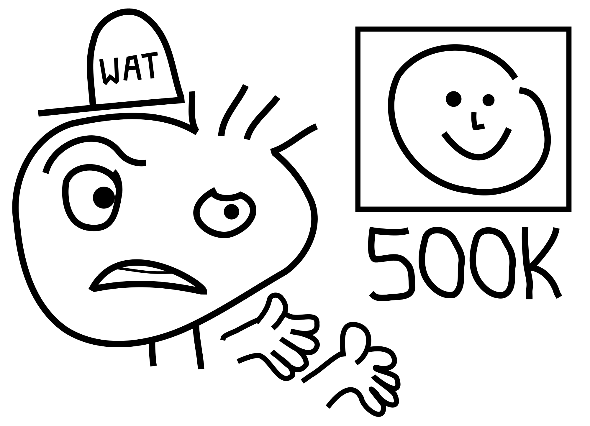 Cartoon face that is weirded out, confused, annoyed, holding hands in one direction to express disbelief and point to a simple drawing labeled with a high number (500K), also looking at it to express disbelief about the combination of that simplicity and number (file size, could also be price). Based on https://openclipart.org/detail/354831/weirded-out-cartoon-face-pointing-out-a-checked-sfw-checkbox - edited in Inkscape, optimized in SVGOMG.