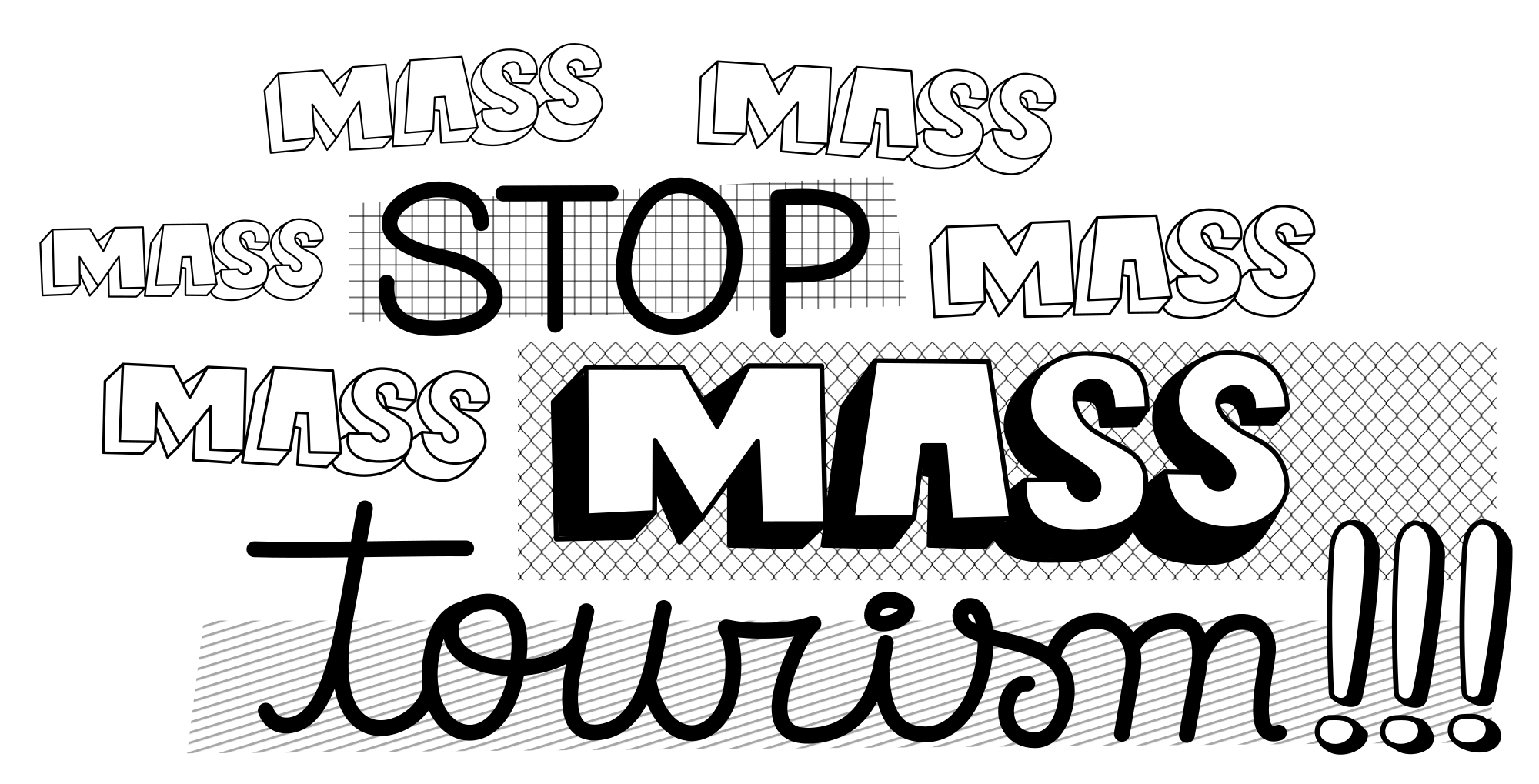 Words STOP MASS TOURISM with some backgrounds.