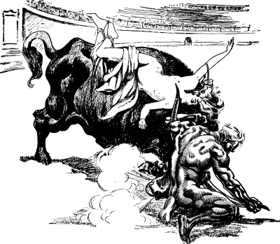 I guess there is some sort of symbolic meaning behind this naked man wrestling a bull with a half naked lady riding on it