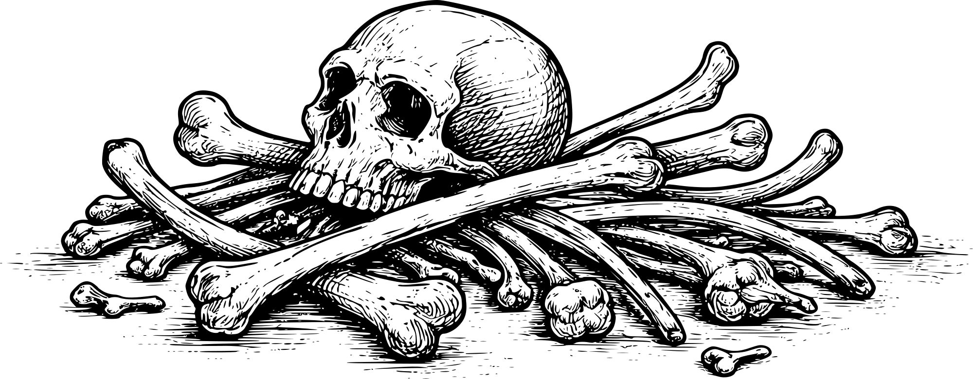 - skull bones skeleton human remains pile of bones crossed bones anatomy death macabre dark fantasy engraving black and white line art high detail horror occult grim antique style