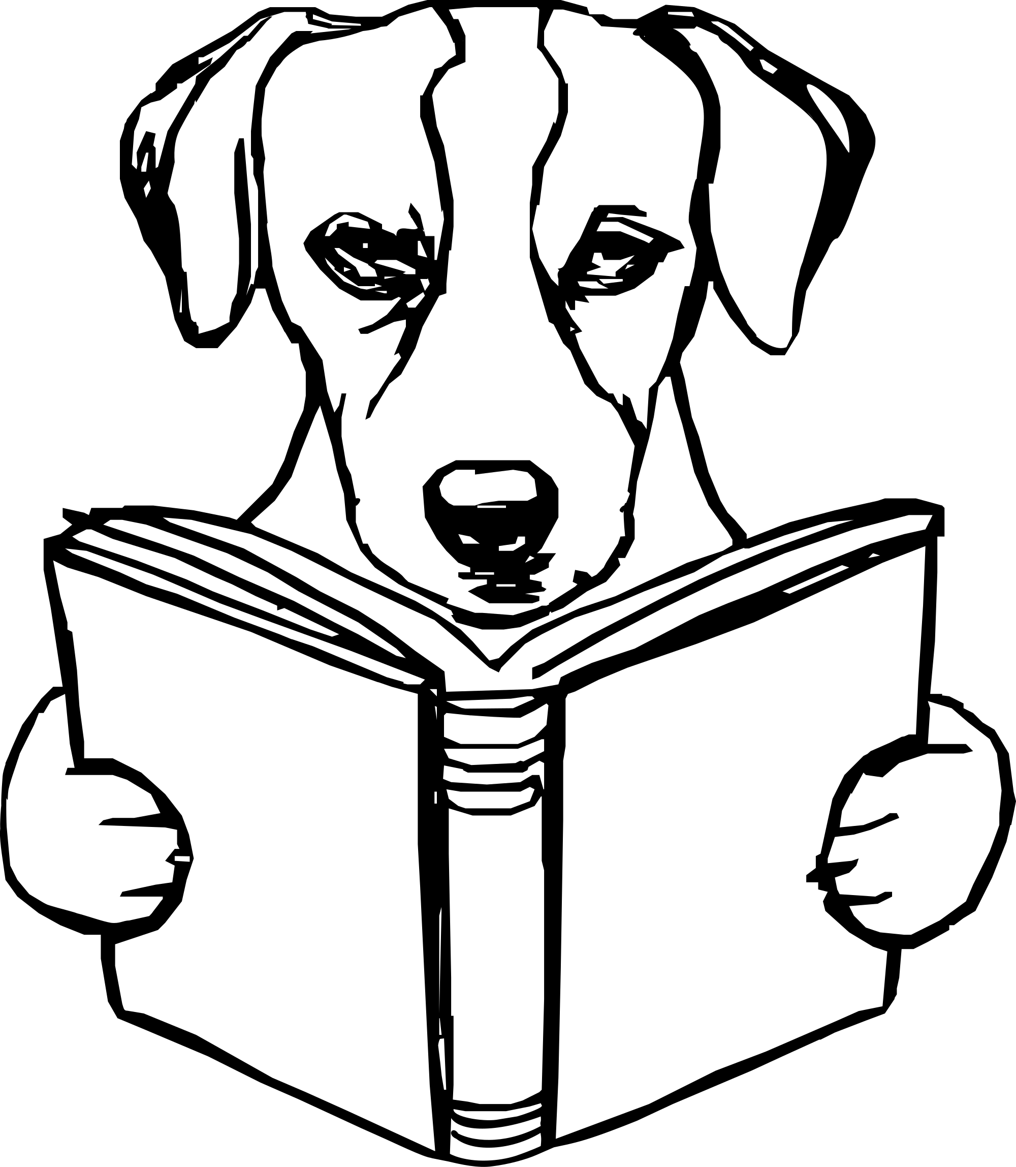 Line drawing of a dog concentrating on reading an open book. Simplified black autotrace with transparency from a Dog Reading a True Crime Book by Crimson Rose from https://www.publicdomainpictures.net/en/view-image.php?image=716737&picture=dog-reading-a-book