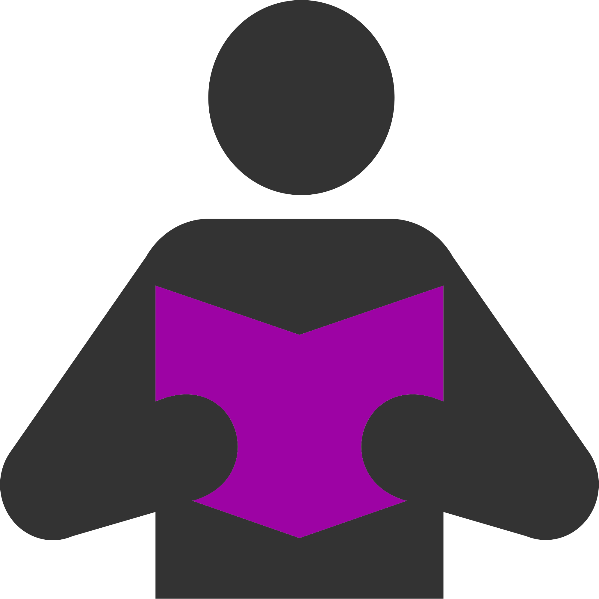 Pictogram or icon of a genderless person reading an open book, showing the back of the book and its purple cover.