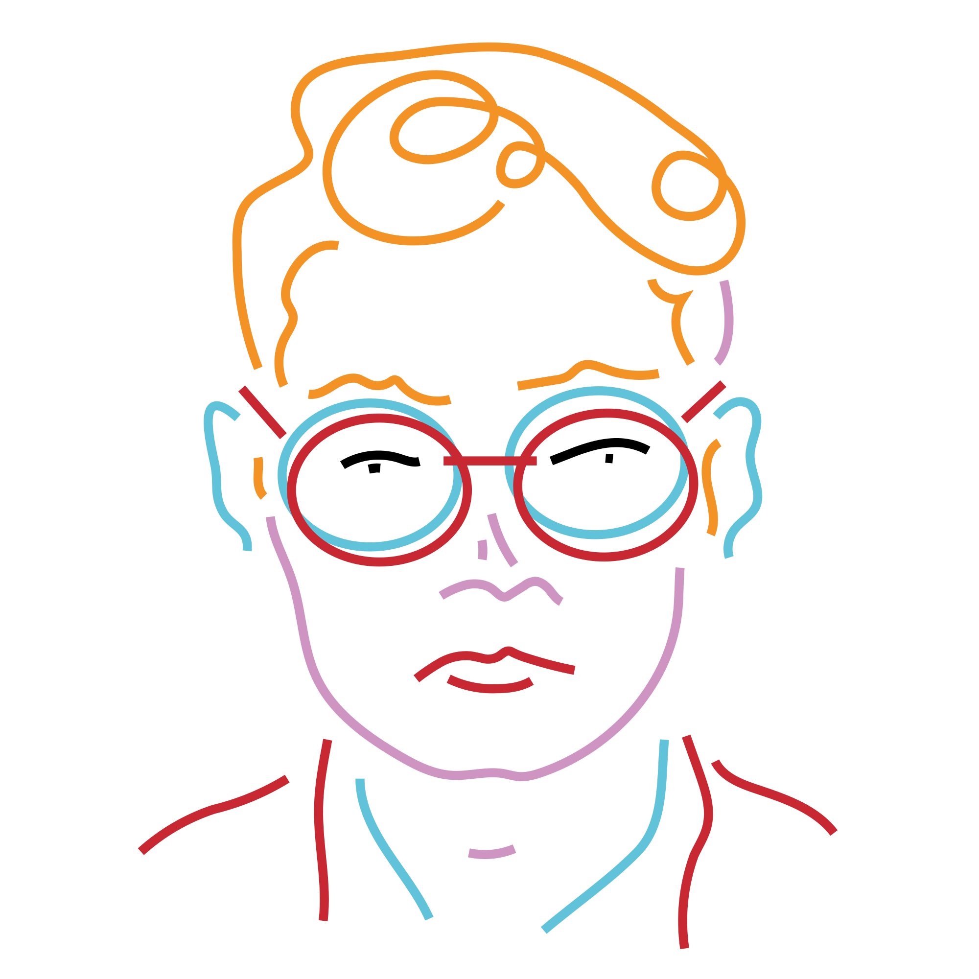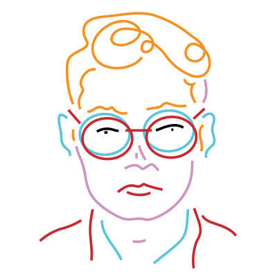 Man or non-binary person with a quiff and round, very thick glasses, in 4 different colors plus black. By HonyKunst on pixabay from 2017, converted to SVG with online-convert and reduced with svgomg. I'm not sure what style this colorful lineart is but I love it.