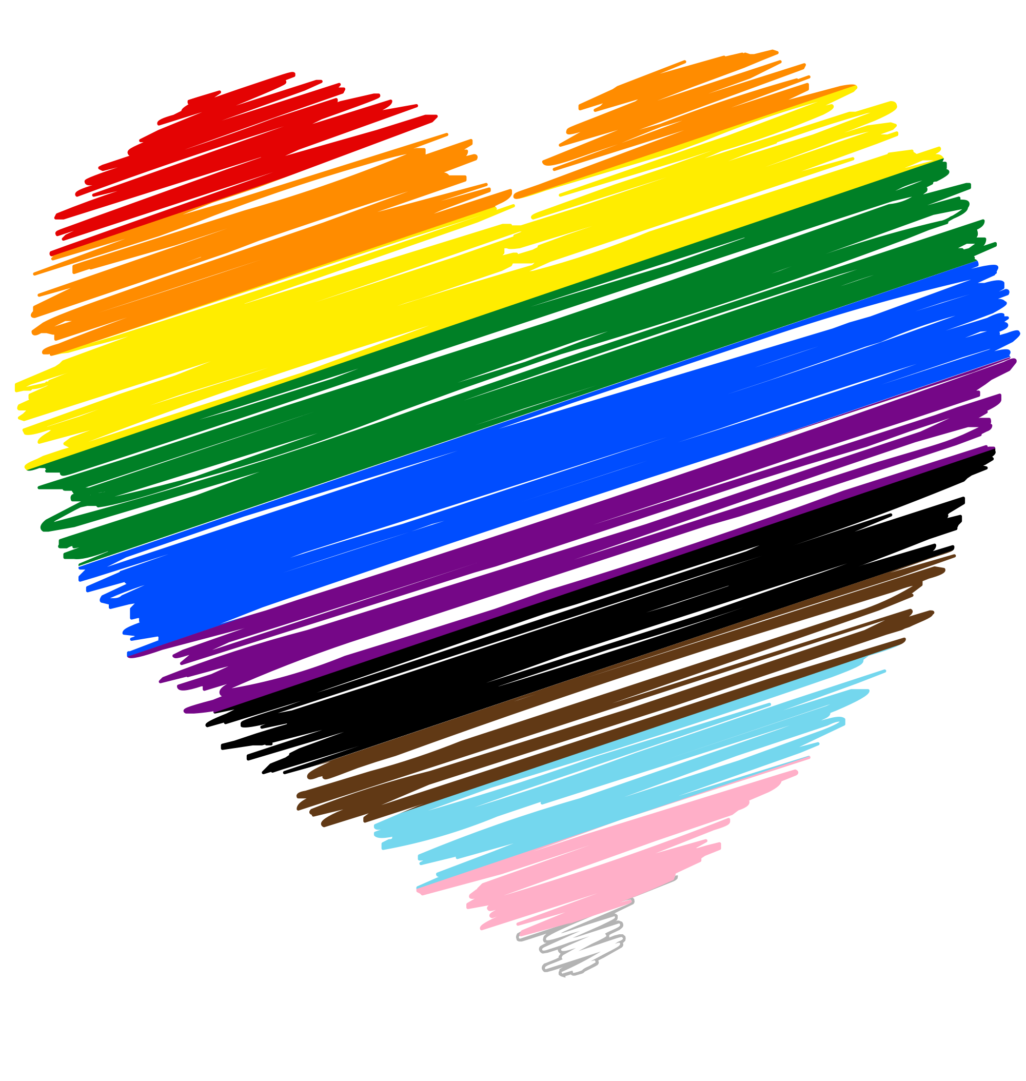 Sketched heart in the colors for Daniel Qasar's LGBTQ progress pride flag, which are: #e40303, #ff8c00, #ffed00, #008026, #004dff, #750787 #000 #613915 #74d7ee #ffafc8 #fff