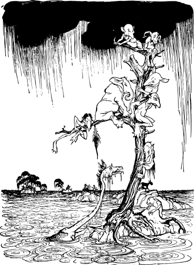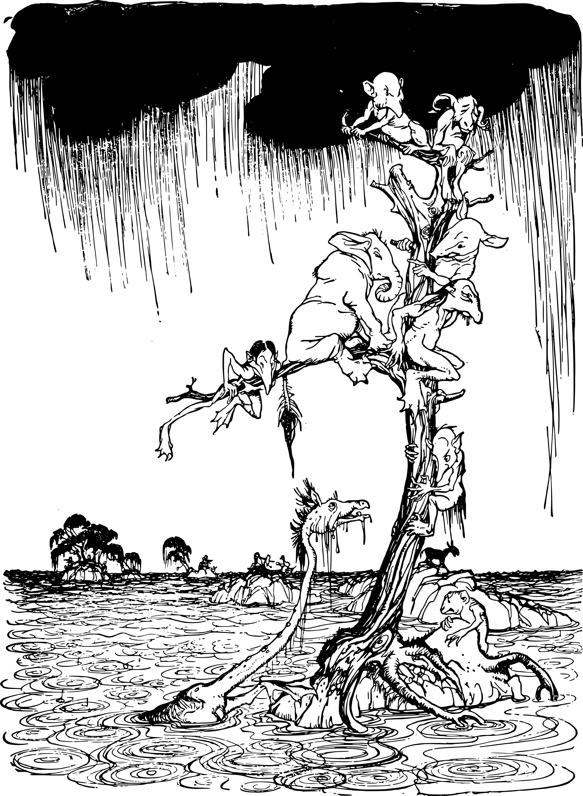 odd fantasy creatures climbing a tree in the rain