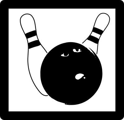 Icon of bowling ball knocking over two pins.