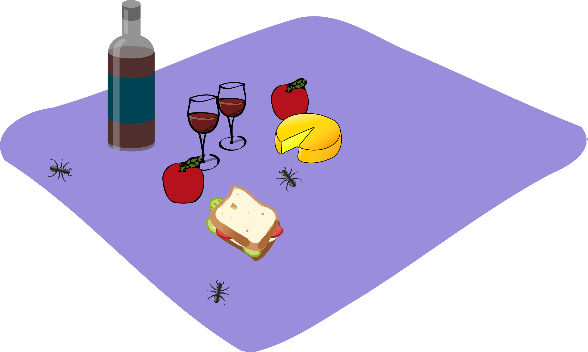 A picnic spread out on a blanket. Pictures from openclipart.org (wine bottle: sheikh_tuhin; wine glass: piotr_halas; cheese: nicubunu; sandwich: rg1024; apple: johnny_automatic; ant: Andy)
